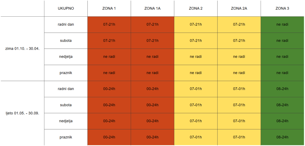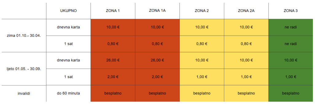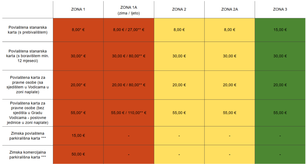 *** zimska povlaštena parkirališna karta i zimska komercijalna parkirališna karta se izdaju u periodu od 01.10. do 30.04. te vrijede u svim aktivnim zonama naplate