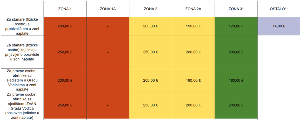 Za pravne osobe i obrtnike sa sjedištem u Gradu Vodicama u zoni naplate